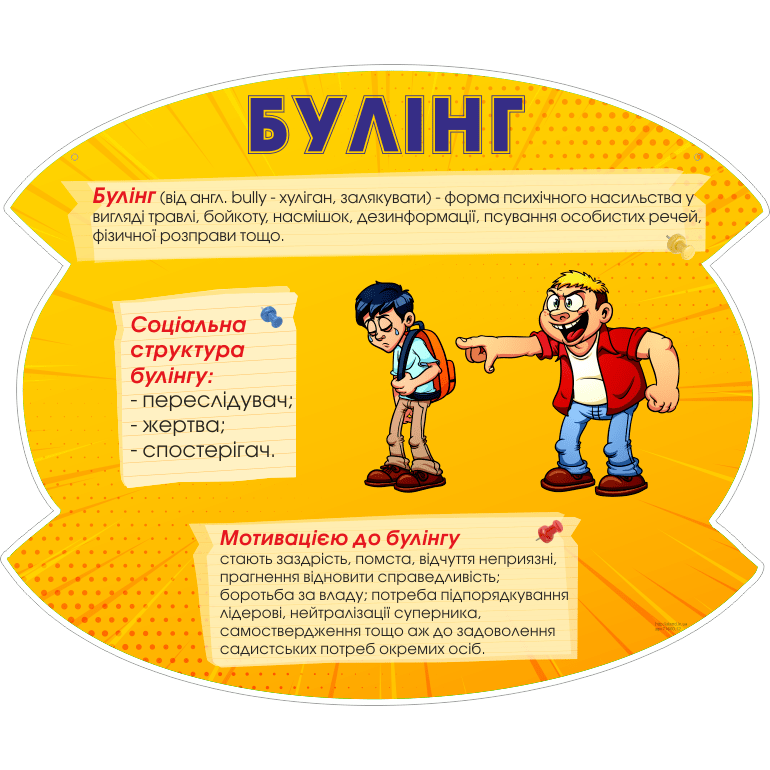 - наявність сторін – кривдник (булер), потерпілий (жертва булінгу), спостерігачі (за наявності);