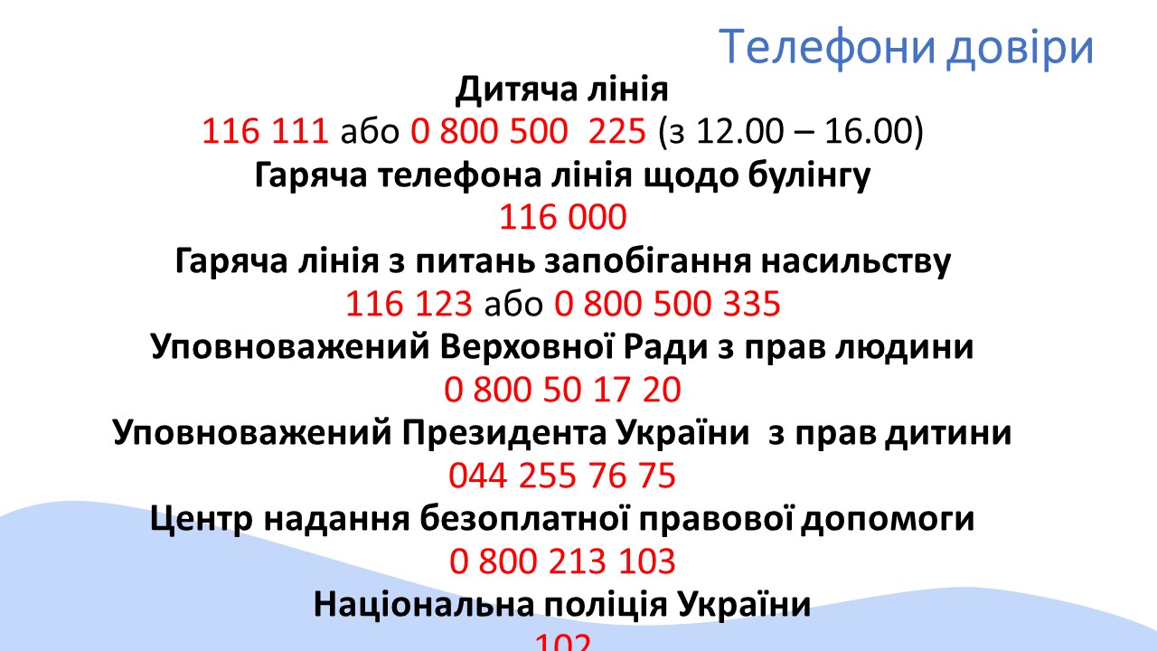 - Створення інформаційних куточків для батьків із переліком організацій, до яких можна звернутися у ситуації насилля та правопорушень.